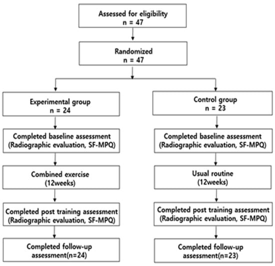 A total of 47 female patients (age 50–60 years) with genu varum and a short form-McGill Pain Questionnaire (SF-MPQ) score of 18.0 or higher were included from the P Department of Rehabilitation Medicine in Seoul, Korea. According to the orthopedic surgeon’s diagnosis, their Kellgren–Lawrence Grades were from 0 to 1, and the study was limited to participants who were able to walk normally despite pain but was suspected to have a joint space that was narrower than normal and had minor cartilage damage [18].