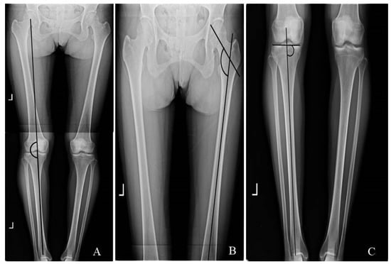 For whole-leg X-ray examination of the lower extremities (INNOVISION ver. 2.0 program, DK Medical Systems Co., Pyeongtaek, Korea), the participants were asked to stand in an upright position while watching the front, while their inside malleoluses of the tibia from both ankles contacted each other. Knee-to-knee length (KTKL) was measured as the distance between the medial epicondyle of the knee joints in the upright position and recorded in units of 0.1 cm [19]. Hip–knee–ankle angle (HKAA) was measured as the medial angle between the lines from the center of the femoral head to the midpoint between the tips of the tibial spines and the superior facet of the talus (Figure 2A). An HKAA of less than 180° was diagnosed as genu varum [20]. Hip inclination angle (HIA) was measured as the angle between two lines: a line connecting 10 cm below the top of the femur neck and 10 cm above the lower center of the femur and a line connecting the thinnest point of the femoral neck and the tip of the femoral head (Figure 2B). HIA less than 125°, a normal angle, was diagnosed as genu varum [21]. Medial proximal tibial angle (MPTA) was measured as the angle between the tibial axis and knee joint line of the proximal tibia (Figure 2C). An MPTA less than 90° was diagnosed as genu varum [22].