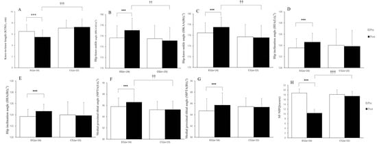 Values are presented as the mean ± standard deviation: (A) knee-to-knee length (KTKL); (B) hip–knee–ankle angle (Left); (C) hip–knee–ankle angle (Right); (D) hip inclination angle (Left); (E) hip inclination angle (Right); (F) medial proximal tibial angle (Left); (G) medial proximal tibial angle (Right); (H) short form-McGill Pain Questionnaire (SF-MPQ). Significant differences using paired t-test: *** p < 0.001. Significant differences using independent t-test: †† p < 0.01, ††† p < 0.001.