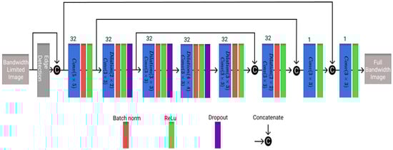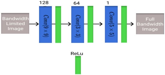 The first architecture that is evaluated is known as the super-resolution convolutional neural network (SRCNN) and is one of the first models to learn end-to-end mapping of low-resolution to high-resolution images. It was one of the first super-resolution DL architectures for computer vision images [33]. The model architecture is shown in Figure 1 with corresponding blocks and the number of filters in each layer.
