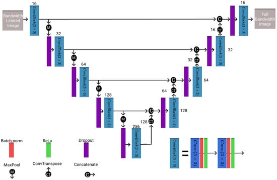 The second architecture evaluated is the U-Net, which is often used for medical imaging segmentation problems [34]. However, it has also been applied in the field of super resolution and denoising to improve image quality or resolution [36,37]. Therefore, the U-Net model is chosen as the benchmark model. However, a ReLu activation instead of the sigmoid activation is applied here for bandwidth improvement. Thus, the model is slightly adjusted by removing the sigmoid activation in the last layer. The model architecture is shown in Figure 2 with the number of filters in each layer and the corresponding block representations.