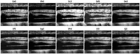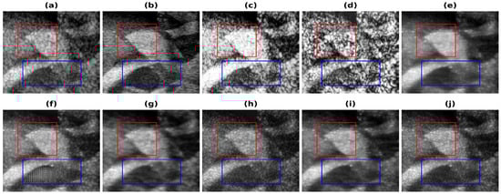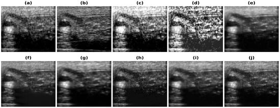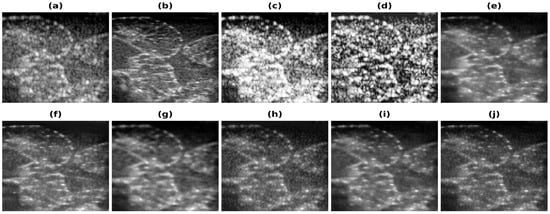 Results of the bandwidth improvement for Commercial phantom for different models (a) Band-limited image (b) Full Bandwidth image (c) Histogram Equalization (d) Contrast Limited Adaptive Histogram Equalization (e) U-Net-PL1 (f) U-Net-PL2 (g) SRCNN-PL1 (h) SRCNN-PL2 (i) REDNet-PL1 (j) REDNet-PL2.