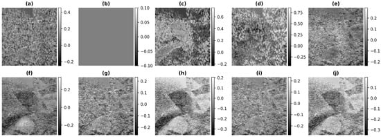 Results of the error of the bandwidth improvement for Phantom I for the different models (a) Band-limited image (b) Full Bandwidth image (c) Histogram Equalization (d) Contrast Limited Adaptive Histogram Equalization (e) U-Net-PL1 (f) U-Net-PL2 (g) SRCNN-PL1 (h) SRCNN-PL2 (i) REDNet-PL1 (j) REDNet-PL2.