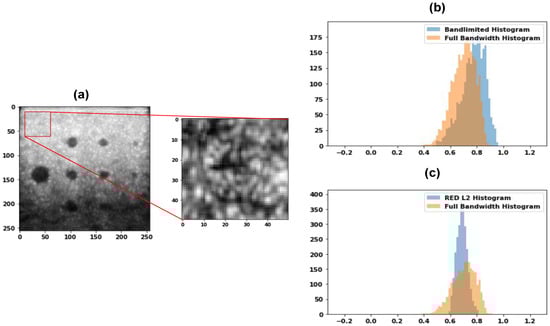 (a) Sample of a Commercial phantom image and the corresponding patch area which we want to analyze, (b) Comparison of the histogram of band-limited and full bandwidth data, and, (c) REDNet PL2 model and full bandwidth histogram.