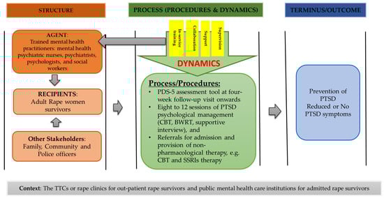 According to Donabedian [], the structure is a setting in which it is necessary to have the structural resources, requisite equipment and personnel to provide the required management. The agent describes a person or item in the structure that is in charge of carrying out an activity and is embedded within the structure. Based on the conceptualized findings of this study, multidisciplinary healthcare practitioners should perform psychological management activities for PTSD. Mental healthcare practitioners must be trained in assessing, diagnosing and managing PTSD. The recipient, referred to as the person or thing that receives service from the agent, is also embedded in the structure []. In this study, all recipients were adult women rape survivors who were diagnosed with PTSD. These adult women rape survivors should either be married or single. According to Dickoff et al. [], non-professional stakeholders may be considered supporters of recipients undergoing treatment. The CF should identify relevant stakeholders to support survivors who are undergoing treatment.