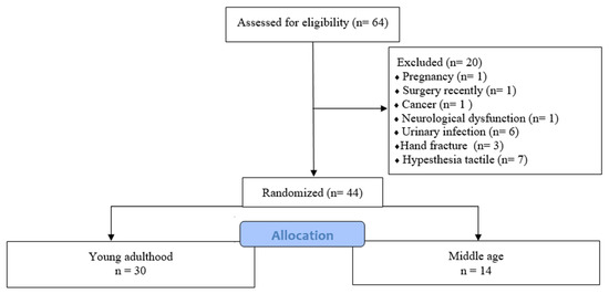 The 44 healthy women were divided into the following groups: young adulthood (18–34 years) (n = 30) and middle age (35–55 years) (n = 14). A flowchart of the sample eligibility is shown in Figure 1.