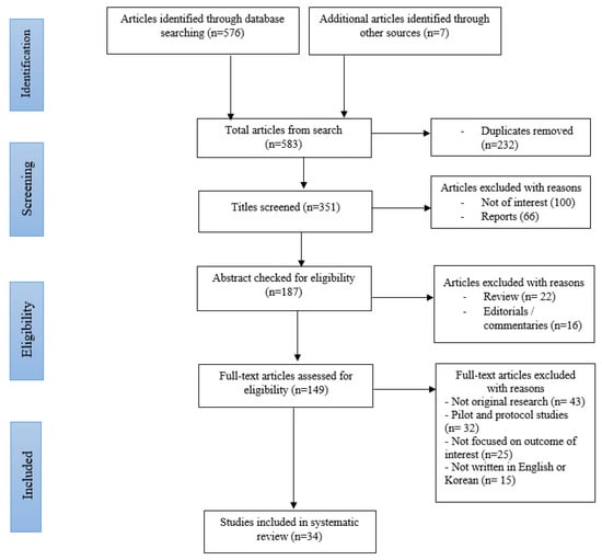 At the end of the article search from the databases, a total of 583 potential studies were identified. The final sample consisted of 34 articles. Inter-rater reliability at the screening phase was κ = 0.91 (95% CI 0.88–0.94), representing a good alignment. All studies took place primarily in South Korea with the study participants recruited from a range of universities. Smartphone addiction was directly or indirectly negatively associated with different outcomes. A heterogenous use of different tools, methods, and smartphone addiction scales was noted across the included studies. The Smartphone Addiction Scale was used in four of the studies, and the Smartphone Addiction Proneness Scale (SAPS) in two of the included studies. The remaining 28 studies each used different tools and measures.