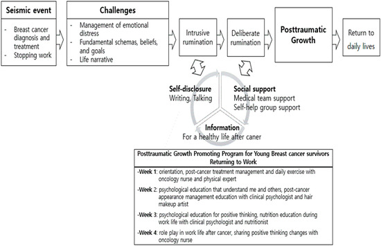 Background: This study aimed to enhance post-traumatic growth in young breast cancer patients by providing them with self-disclosure and social support resources, to reduce intrusive rumination and increase deliberate rumination. This study was conducted at a university-based cancer center in Seoul, South Korea. The study included a four-week group-based psychoeducational program, which supported the post-traumatic personal growth of breast cancer patients. The primary outcome was increased post-traumatic growth, and the secondary outcomes were rumination, distress, and traumatic perception. Methods: The study included 38 young breast cancer patients, with a mean age of 42.21 years and mean time since diagnosis of 13.84 months. Results: Results of the study revealed statistically significant improvements in total post-traumatic growth and all subdomains, after the intervention (p < 0.001) and one month later (p < 0.001), as compared to the baseline. A significant improvement was also observed in deliberate rumination after the intervention (p = 0.038). Furthermore, the patients had a statistically significant decrease in anxiety, after the intervention (p = 0.035) and one month later (p = 0.005), as compared to the baseline. Conclusions: Overall, the program encourages activities that promote post-traumatic growth, enabling young breast cancer patients to return to their normal lives. Specifically, the growth allows patients to return to work and maintain a healthy body and mind. The results of this study indicate that this program can be used as an effective psychological intervention for young breast cancer patients.