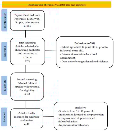 Figure 1 shows the PRISMA flowchart where the whole bibliographic search process is outlined. A total of 854 records were retrieved through our searches in PsychInfo, ERIC, WoS and Scopus databases. After the identification phase, the first screening was carried out for further evaluation, where 70 articles were selected after eliminating duplicates and according to the inclusion criteria. Then, 40 papers where selected in the second screening, where the articles were analyzed and read full-text for eligibility. Finally, 13 studies were considered to be appropriate for the study.