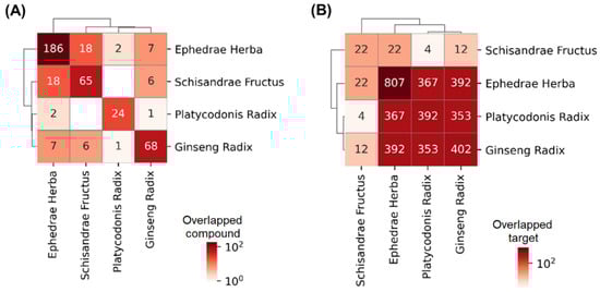 Overlaps in the bioactive compounds or the targets of herbs. The number and color in each cell indicate the number of overlapped (A) compounds or (B) targets of the herbs corresponding to the row and column (The numbers and colors on the diagonal line indicate the number of compounds and targets corresponding to the herb).