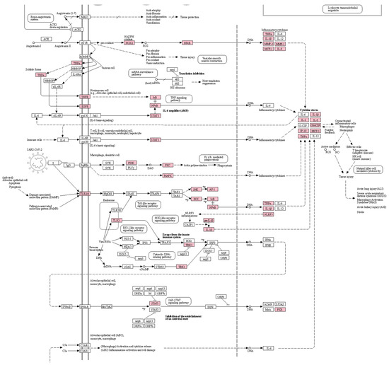 A pathway for coronavirus diseases highlighting the potential targets of the drug combination. Boxes and arrows between them indicate the proteins that consist of the pathway and interactions between the proteins, respectively. Pink-colored boxes indicate the targets of the drug combination. The graph image was generated by a KEGG mapper and cropped by the authors because of the page limit. The uncropped image is shown in Supplementary Figure S1.