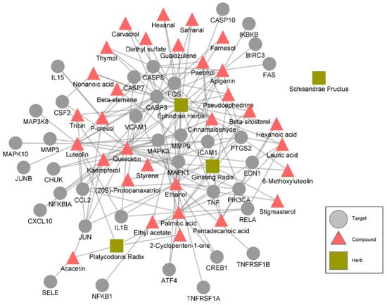 Network pharmacological analysis in TCM focuses on the interaction between multiple compounds in drugs and their multiple targets to elucidate system-level effects and mechanisms of drugs [35]. In this study, TCMSP (https://tcmsp-e.com/tcmsp.php (accessed on 30 May 2022)) [36] was employed to collect compound information on EH, PR, GR, and SF. TCMSP collects information about compounds of herbs by conducting a comprehensive literature search and by retrieving structure data about compounds from PubChem [37], ChEMBL [38], and ChemSpider [39]. To predict drug-like compounds in herbal drug, we applied a quantitative estimate of drug-likeness (QED), which infers drug-likeness based on molecular properties (such as octanol–water partition coefficient and number of hydrogen bond donors) and outperform Lipinski’s rule of five in distinguishing drugs from a set of chemicals [40]. Based on QED, compounds with a low possibility of exerting therapeutic effects via oral administration were excluded. The threshold value of QED for excluding the compounds was 0.35 [40]. The STITCH database (http://stitch.embl.de/ (accessed on 30 May 2022) was used to identify the potential protein targets of compounds [41]. For a given chemical-protein interaction, the STITCH database provides four types of individual scores indicating the likelihood or relevance of each individual type of evidence: experimental evidence of direct chemical-protein bindings, text mining of MEDLINE and OMIM, annotated chemical-protein interactions from other databases, and 2D chemical fingerprint-based prediction [42]. The individual scores are combined into an overall score (called the combined score), and the closer the score is to 1, the greater the likelihood of interaction. In this study, highly confident interactions with combined scores greater than 0.7 were selected.