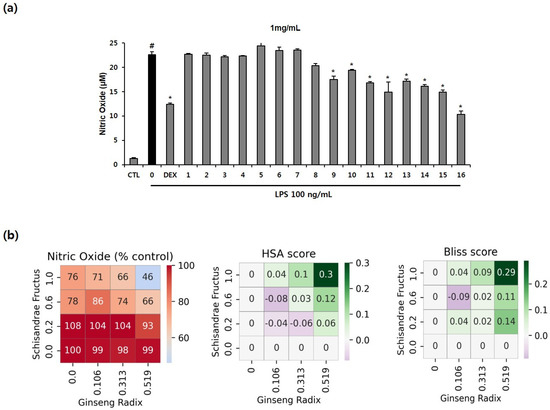We evaluated the production of NO with the combinations of EH, PR, GR, and SF in LPS-induced inflammation in RAW264.7 cells. Further, we determined the cytotoxic effects of various concentrations of the EH, PR, GR, and SF combinations in RAW264.7 cells. Most combinations were cytotoxic up to 3 mg/mL (Supplementary Figure S2). NO production was tested with 1 mg/mL of the combinations that exerted not toxic effect in LPS-stimulated murine macrophages. As shown in Figure 4a, only the nitrite level of the LPS-treated group increased relative to that of the untreated group. Combinations 1-8 did not affect the release of NO, while combinations 9–16 inhibited nitrite production compared to LPS treatment. In particular, combination 16 (SF: 0.519 g, GR: 1.0 g) induced a greater reduction in NO level than dexamethasone, which was employed as the positive control (Figure 4a).