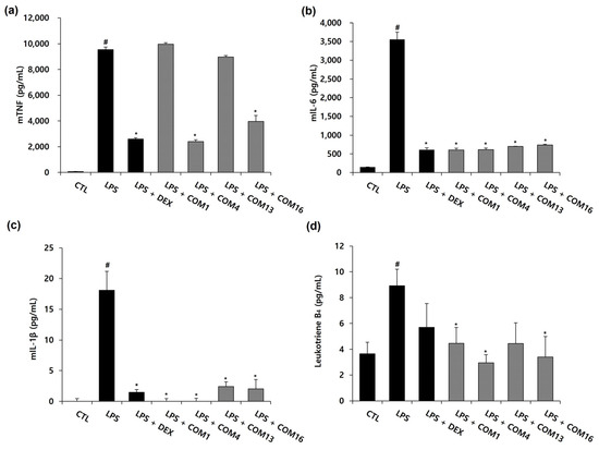 Effects of the drug combinations on the LPS-induced production of inflammatory cytokines in RAW264.7 cells. Murine macrophages were pretreated with 1 mg/mL of the drug combination 1, 4, 13, and 16 (drug combination 1 (COM1), EH: 0.273 g and PR: 0.263 g; drug combination 4 (COM4), EH: 0.273 g, PR: 0.263 g and SF: 0.519 g; drug combination 13 (COM13), EH: 0.273 g, PR: 0.263 g and GR: 1.0 g; drug combination 16 (COM16), EH: 0.273 g, PR: 0.263 g, SF: 0.519 g and GR: 1.0 g) for 2 h, followed by 100 ng/mL of LPS for 22 h. Cytokine accumulations for TNF (a), IL-6 (b), IL-1β (c) and Leukotriene B4 (d) were analyzed by an ELISA at 540 nm. The values are presented as mean ± SD (n = 3). # p < 0.05 compared to the untreated group. * p < 0.05 compared with the LPS-treated group.