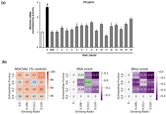 Phorbol 12-myristate 13-acetate (PMA), one of the substances that increases the expression of genes related to mucus secretion in respiratory epithelial cells, is a protein kinase C (PKC) activator that is known to increase MUC5AC expression by inducing an inflammatory response [49]. To investigate the inhibitory effect of 16 MHRCs on PMA-induced MUC5AC mRNA expression, 100 μg/mL of MHRCs, a concentration that is non-toxic to NCI-H292 cells (Supplementary Figure S3), was administered as a pretreatment for 1 h, followed by 100 nM PMA for 24 h. Dexamethasone was used as a positive control. The MUC5AC mRNA expression level was determined using qPCR. The expression level of MUC5AC mRNA was significantly increased by PMA and significantly decreased by the positive control, dexamethasone. Sixteen types of MHRCs significantly decreased MUC5AC mRNA expression compared to PMA, and MHRC 11 had a better inhibitory effect than the other 16 combinations (Figure 6a).