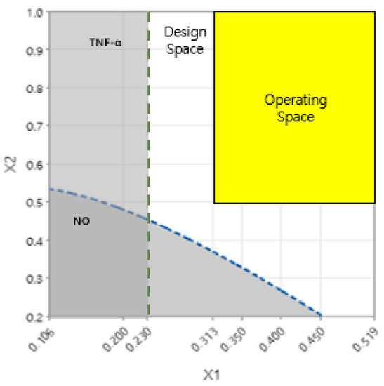 In this study, DS was derived using two DOE methods. DS for NO as the response value was derived by applying a central composite face-centered design, which is one of the RSMs. Further, DS for TNF-α, IL-6, IL-1β, and LTB4 as the response value was established using a full factorial design, which is one of the factorial designs. Based on ANOVA, it was statistically significant for NO, TNF-α, IL-6, IL-1β, and LTB4 (p-value < 0.05). The parameter for DS was set, as shown in Table 7, and the DS for NO, TNF-α, IL-6, IL-1β, and LTB4 was determined. The OS range of GR and SF was 0.313 to 0.519 and 0.5 to 1.0, respectively. The establishment of the OS was satisfied with the upper limits of all response values. Accordingly, the interaction effect of GR and SF was confirmed to have a positive anti-inflammatory effect (Figure 7).