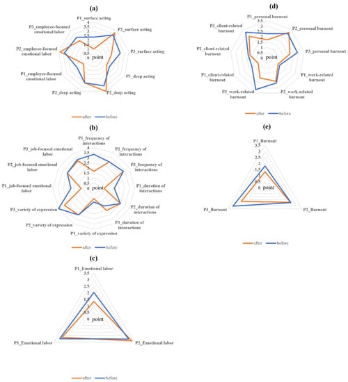According to the evaluation results after participating in the program, two participants, participant 1 (P1) and participant 3 (P3), showed a decrease in the level of emotional labor (P1: from 2.02 to 1.33, P2: from 3 to 2.79), while the other participant, participant 2 (P2), showed an increase (from 3.05 to 3.33). Specifically, P1 and P2 showed a decrease in both aspects of measured emotional labor, employee-focused emotional labor (P1: from 2.17 to 1.33, P3: from 3 to 2.5) and job-focused emotional labor (P1: from 2.25 to 1.25, P3: from 3.25 to 3.13). However, P2 showed an increase in employee-focused emotional labor (from 3.33 to 3.83) and both subscales of employee-focused emotional labor, surface acting (from 3.33 to 3.67) and deep acting (from 3.33 to 4). P2 also showed no change in all three subscales of job-focused emotional labor, including frequency of interactions, duration of interactions, and variety of expressions. P1 and P2 showed an overall decrease across the subscales of employee-focused emotional labor and job-focused emotional labor (Figure 2a,c).