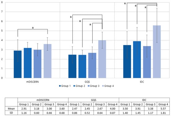 | mDISCERN, total | 2.91 ± 1.16 | 3.18 ± 0.60 | 3.00 ± 0.66 | 3.60 ± 0.68 | 0.013 |