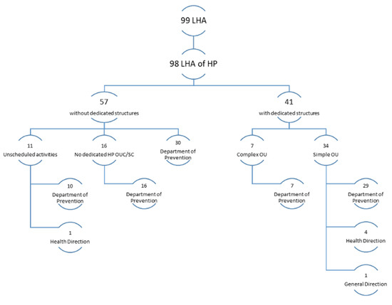 In Italy, there were 41 facilities dedicated to HP, of which 7 were complex operational units (COUs), and all of them reported to a department (of prevention, hygiene and health prevention, or public health). Of the simple units (SUs), most (29) reported to one of the above departments, 4 to the Health Directorate, and 1 to the General Directorate. The LHAs that did not have any dedicated OUs carried out HP activities with projects and initiatives coordinated directly by the facilities dealing with related issues (public hygiene and health, food hygiene and nutrition, etc.) or directly by the prevention department, as was the case for 30 out of 57 cases (Figure 2).