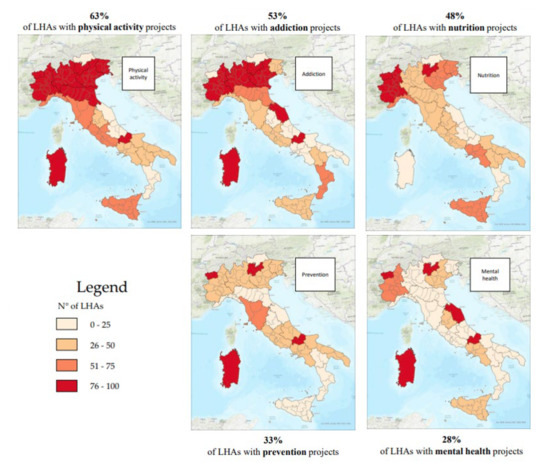 To answer point 4, the results of the inclusion of the words “health promotion” and/or focusing on the sections of dedicated facilities, where present, were explored. All projects or initiatives promoted by the LHAs on their websites were collected, paying attention to the year of reference, as some were named but not active, and to the degree of depth and accuracy of their description. In a second step, the active projects were classified into macro-areas that could indicate the main themes of the HP, as follows: