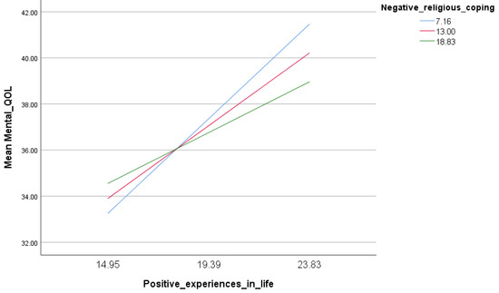 A moderation analysis was conducted, taking positive/negative experiences in life as independent variables, positivity and positive/negative religious coping as concurrent moderators, and physical/mental QOL as dependent variables. The results showed that only the interaction negative religious coping by positive experiences in life was significantly associated with higher mental QOL (Beta = −0.04; t = −2.19; p = 0.029; 95% CI −0.07; −0.004); in people with high positive experiences in life, those with higher negative religious coping had lower mental QOL (Figure 1).