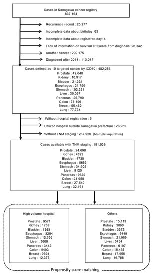 - Tsukada, Y.; Nakamura, F.; Iwamoto, M.; Nishimoto, H.; Emori, Y.; Terahara, A.; Higashi, T. Are hospitals in Japan with larger patient volume treating younger and earlier-stage cancer patients? An analysis of hospital-based cancer registry data in Japan. Jpn. J. Clin. Oncol. 2015, 45, 719–726. [Google Scholar] [CrossRef] [PubMed][Green Version]