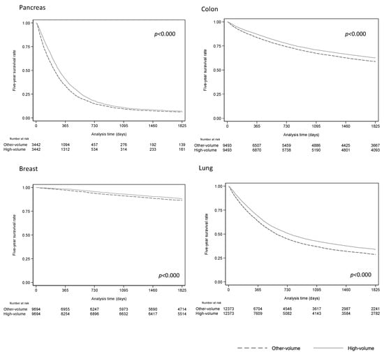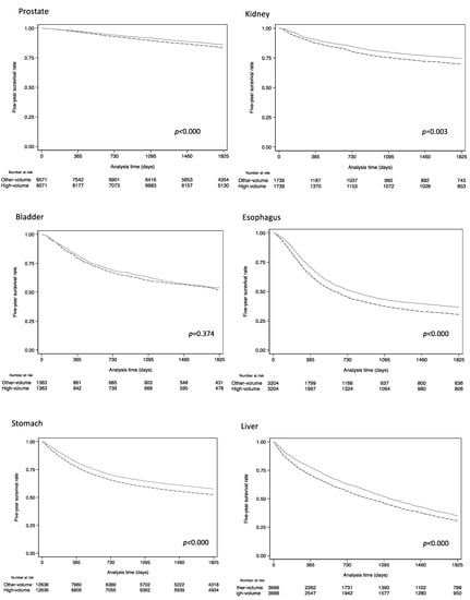 - Okawa, S.; Tabuchi, T.; Morishima, T.; Koyama, S.; Taniyama, Y.; Miyashiro, I. Hospital volume and postoperative 5-year survival for five different cancer sites: A population-based study in Japan. Cancer Sci. 2020, 111, 985–993. [Google Scholar] [CrossRef]