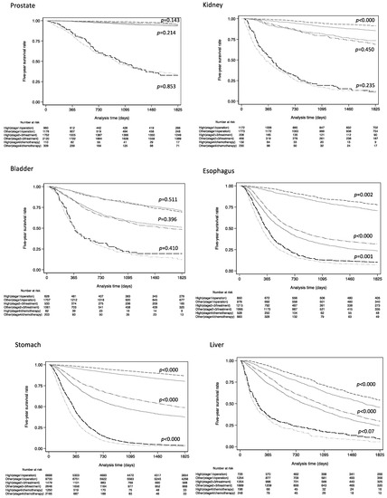 Figure 3 shows Kaplan–Meier survival estimate curves for 5-year overall survival among patients who underwent surgery at stage 1, those who received some form of treatment at stages 2 and 3, and those who received chemotherapy at stage 4. Log-rank tests showed statistical significance for all cancers except bladder and prostate cancer in stage 1 with operation. In stages 2 and 3 with some form of treatment, seven cancers not including prostate, kidney, and bladder cancer showed significantly long prognosis in high-volume hospitals. In stage 4 with chemotherapy, only esophagus, stomach, and lung cancer showed a significant difference.