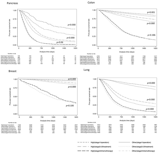 Differences in prognosis by hospital volume for the TNM available to those who underwent surgery at stage 1, those who received some form of treatment at stages 2 and 3, and those who received chemotherapy at stage 4. Log-rank test showed statistical significance (p < 0.001) for all cancers except bladder cancer in stage 1 and stages 2 and 3. In stage 4, only esophagus, stomach, and lung cancer showed a significant difference.