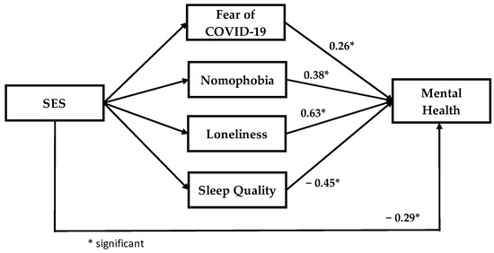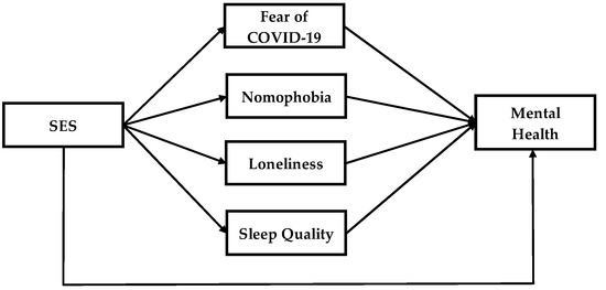 The framework of the study is presented in Figure 1. The research framework of this study is being created by the combination of the theoretical framework with the addition of some new ideas. Independent and dependent variables in this research relate to each other by using the mediator to gain the output. The research framework includes six latent variables. Socio Economic Status (SES) is presented as an independent variable and mental health as a dependent variable. Our framework contains four mediators which are fear of COVID-19, nomophobia, loneliness and sleep quality. This research is delivered through a cross-sectional study design.
