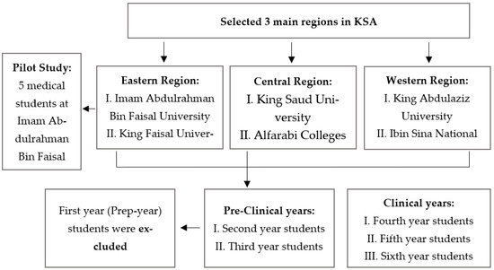 The target population for this study were undergraduate, pre-clinical and clinical, male and female, 2nd–6th years medical students enrolled in any of the following six major medical training institutions: Imam Abdulrahman Bin Faisal University (IAU), King Faisal University, King Saud University, Alfarabi Colleges, King Abdulaziz University, and Ibin Sina National College. These institutions were chosen as they are the largest medical training facilities in the respective targeted KSA regions. Preparatory, 1st year undergraduate medical students in KSA have typically not yet started their medical training, and as such were excluded from this study. Student data collectors were enrolled from all of the above six institutions and trained to distribute the study survey through key student SM platforms in their institutions. The data collection process is summarized in Figure 1.