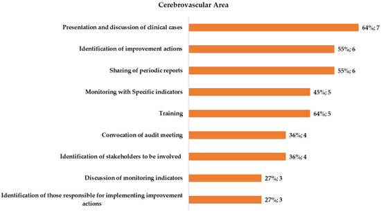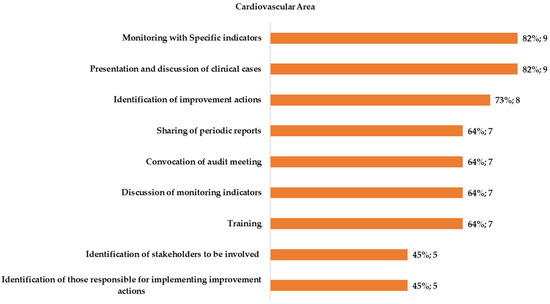 Out of the 11 hospitals that participated in the survey for the CaV area, 10 (91%) reported performing A&F activities at unit level and 8 (73%) declared the presence of a hospital unit dedicated to their implementation (e.g., Quality Management Unit) (Figure 1). All facilities declared to perform at least one of the activities defined as “assimilating A&F procedures.” Among these, the most frequently reported activity was the presentation and discussion of clinical cases (82%) and the least frequent was the identification of those responsible for the implementation of improvement actions (45%).