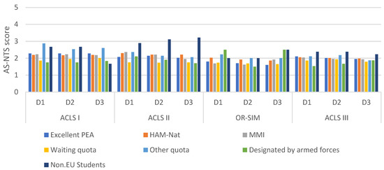 The comparison of NTS performance of the different cohorts of students indicated that students admitted via waiting quota and designated by the Armed Forces, performed significantly better than students admitted by excellent PEA (p = 0.026). Non-EU students showed significantly inferior performance on all AS-NTS dimensions (p = 0.003). The students admitted via HAM-Int performed slightly better on all the three NTS dimensions and the students admitted via HAM-Nat performed slightly inferior to the students admitted via excellent PEA. These differences were not statistically significant (p = 0.956 and p = 0.604) but relevant based on the global testing, which revealed more variances than there might be solely due to coincidence: Adjusted R² = 0.05, DF = 1087, F-Statistic = 7.055, p < 0.001 (Figure 1, Table 3).
