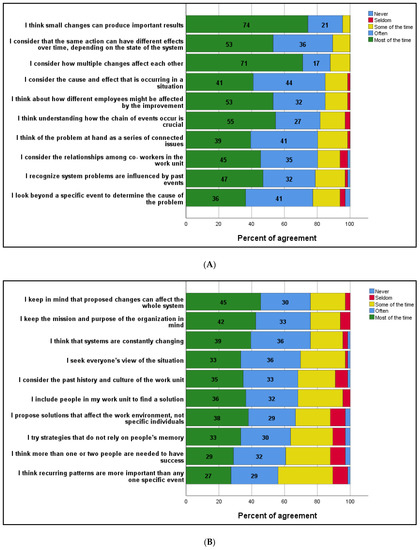 “I think small changes can produce important results” (95%), Figure 1A; “I consider that the same action can have different effects over time depending on the state of the system” (89%), Figure 1A; “I consider how multiple changes affect each other” (88%), Figure 1A; “I consider the cause and effect that is occurring in a situation” (85%), Figure 1A; “I think about how different employees might be affected by the improvement” (85%), Figure 1A; “I think understanding how the chain of events occur is crucial” (82%), Figure 1A; “I think of the problem at hand as a series of connected issues” (80%), Figure 1A; “I consider the relationship among co-workers in the work unit” (80%), Figure 1A; “I keep in mind that proposed changes can affect the whole system” (75%), Figure 1B. The data for system thinking statements and students’ degree of agreement with each statement are available in Figure 1A,B.