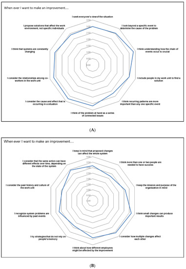 A radar chart was used to show the system thinking items that were the most apparent in the horror room setting. The following statements had the most agreement: “I think understanding how the chain of events occur is crucial”, “I think small changes can produce important results”, and “I consider how multiple changes affect each other”. The statements with the least agreement were “I think recurring patterns are more important than any one specific event” and “I think more than one or two people are needed to achieve success”. The radar chart of system thinking items is displayed in Figure 2A,B.