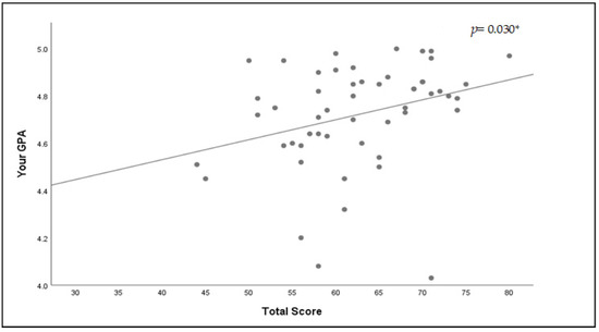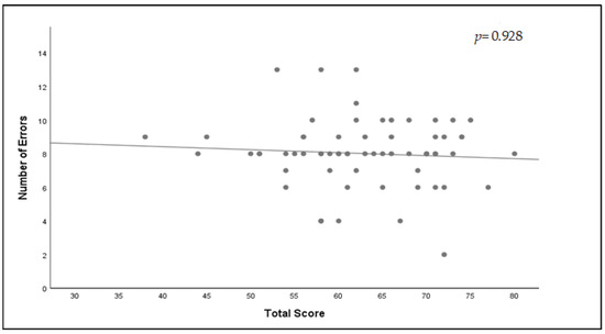 Regarding the relationship between the number of errors identified and STS, no association was found (Spearman’s correlation coefficient = 0.01, p = 0.928; Figure 3). However, an association was found between GPA and STS (Spearman’s correlation coefficient = 0.27, p = 0.03; Figure 4).