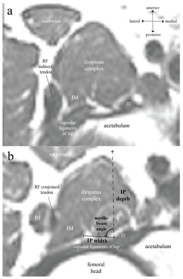 Axial plane of T2-weighted magnetic resonance (MR) images of the human right hip: (a) At the level where rectus femoris (RF) indirect tendon appears and extends anteroposteriorly towards acetabular rim; (b) At the level 10–15 mm caudal to Figure 1a, where the RF indirect and direct tendon merge into its conjoined tendon, the iliopsoas plane (IP) width, depth, and needle-beam angle were measured. The anterior skin surface used for IP depth measurement is not shown.
