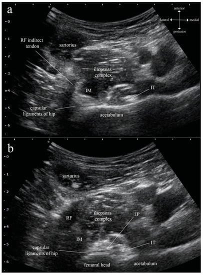 Ultrasound transverse scan of the human right hip with a curvilinear probe: (a) At the level corresponding to Figure 1a, the rectus femoris (RF) indirect tendon is an easily identifiable, elongated hypoechoic shadow lateral to the iliopsoas complex that can be used as a startup sonographic landmark to identify the iliopsoas plane (IP) at the level of iliopsoas plane block (IPB) and anterior hip pericapsular neurolysis. Under ultrasound, the iliopsoas complex and the capsular ligaments of hip are both hypoechoic, while iliopsoas tendon (IT) is a hyperechoic ovoid structure situated at the medial corner of iliopsoas complex. (b) At the level corresponding to Figure 1b, in between the iliopsoas complex and capsular ligaments of hip, the IP appears as a fuzzy, hyperechoic layer. The IM medial border is, in general, very difficult to identify sonographically, making the lateral margin of IP obscure and hard to define on ultrasound.