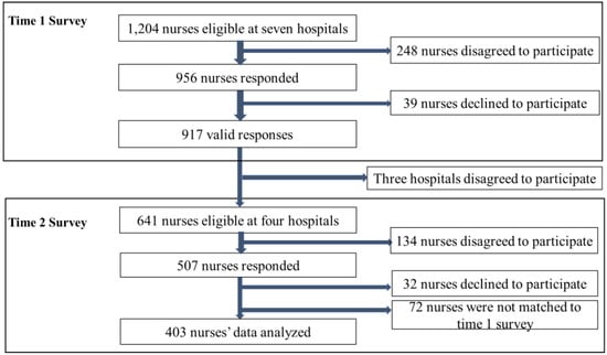 Using snowball sampling, we selected seven general hospitals with more than 200 beds in four prefectures in Japan. All staff nurses working in the hospitals were surveyed (n = 1204). Of the seven hospitals, three were in urban areas, and four were in rural areas. The inclusion criteria were staff nurses with at least 10 months of work experience. Nurse managers, such as division directors, assistant division directors, head nurses, and assistant head nurses were excluded from the study. A total of 956 staff nurses returned the first survey (response rate: 79.4%), and 507 of those who returned the first survey returned the second one (response rate: 53.0%) (see Figure 2).