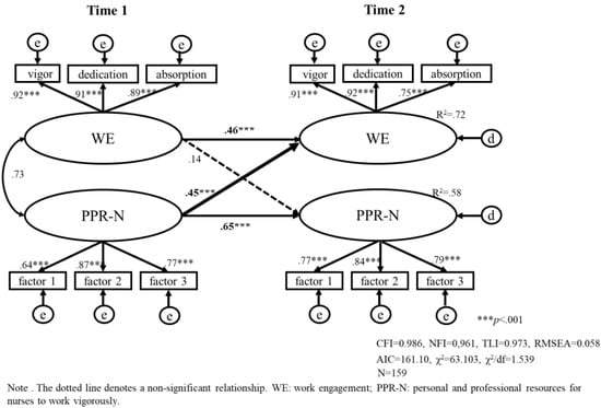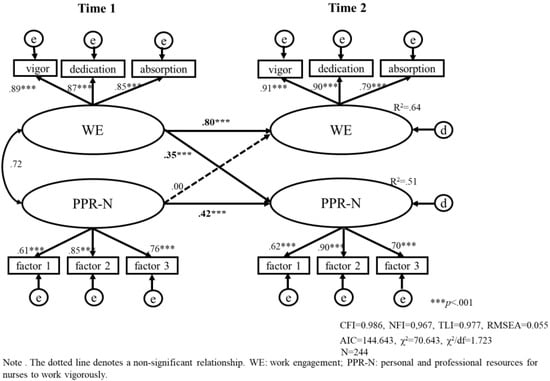 We collected data using an anonymous questionnaire. In the first survey (February–March 2019), the questionnaires were distributed to nurses by the collaborators (head nurse or deputy) of each hospital, who then collected the sealed questionnaire after completion. The second survey (May–June 2019) was conducted similarly and sent only to nurses who had responded to the first survey. The sealed questionnaires were also collected via the hospital collaborators. Each participant was assigned a unique identifier used on both surveys so that the surveys could be linked without identifying the participant. The cross-lagged design requires that we assess the correlation between variables measured at two different times. To this end, we used PPR-N as a predictor of work engagement among nurses, measured in two different surveys administered three months apart. In the following, Time1 corresponds to measures derived from data collected from February–March 2019, and Time2 corresponds to measures derived from data collected from May–June 2019. In addition, in prior studies, job crafting [] and a web-based stress and depression literacy [] interventions were reported to significantly improve work engagement after three or four months. Therefore, we surveyed twice after a time frame of three months later for this study, based on these studies.