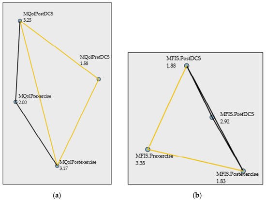 Pairwise comparisons Friedman’s test. (a) Multiple Sclerosis International Quality of Life (MusiQoL). (b) Modified Fatigue Impact Scale (MFIS).