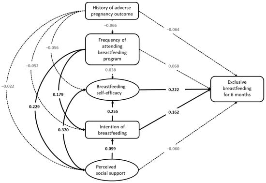 Seven of the fifteen paths suggested in the hypothetical model were statistically significant (p < 0.05). The frequency of attending a breastfeeding program directly affected perceived social support and intention (β = 0.229, p = 0.004; β = 0.179, and p = 0.003, respectively) and indirectly affected intention, self-efficacy, and exclusive breastfeeding for 6 months (β = 0.023, p = 0.032; β = 0.136, p = 0.002; β = 0.058, and p = 0.002, respectively). Perceived social support directly affected intention and self-efficacy (β = 0.099, p = 0.042; β = 0.370, and p = 0.003, respectively) and indirectly affected self-efficacy and exclusive breastfeeding for 6 months (β = 0.025, p = 0.028; β = 0.104, and p = 0.002, respectively). Intention directly affected self-efficacy and exclusive breastfeeding for 6 months (β = 0.225, p = 0.002; β = 0.162, and p = 0.002, respectively) and indirectly affected exclusive breastfeeding for 6 months (β = 0.057 and p = 0.001). Self-efficacy directly affected exclusive breastfeeding for 6 months (β = 0.222 and p = 0.002). A history of fetal or infant adverse pregnancy outcomes indirectly affected exclusive breastfeeding for 6 months (β = −0.033 and p = 0.027).