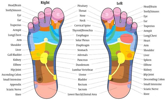 - Abdelmoneam, H.M.M. Facts on Reflexology: A Comprehensive Nursing Review. Int. J. Nov. Res. Healthc. Nurs. 2018, 5, 15–24. [Google Scholar]