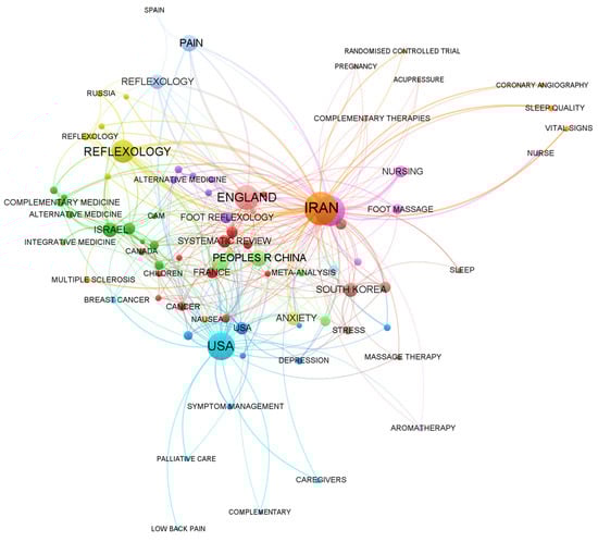 Clusters of similar topics in foot reflexology studies in countries around the world (conditions are calculated with a keyword frequency ≥ 5 and a country frequency ≥ 10).