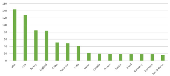 To identify the main countries and regions involved in the field of foot reflexology as well as international collaborations, this study visualized the interactions between countries and regions. Figure 3 shows the geographical distribution of the main countries worldwide and the knowledge domains of the co-authorization. This research found 62 countries around the world participating in the study of reflexology. The nodes represent different countries, while the sizes of the nodes represent the domain activity and scientific output of the country. The various colors represent different clusters of the co-location matrix based on the corresponding countries. The connection between the two nodes indicates their knowledge collaboration. The thickness of the lines indicates the degree of collaboration. Obviously, the stronger the connection between two nodes, the deeper the contact and cooperation between the two countries. From the figure, 12 clusters could be seen. Figure 4 shows the top 15 countries with the most published papers, among which the top three countries were the United States, Iran, and Turkey, and Table 2 presents the related research in each country, which mostly focuses on the application analysis of foot reflexology. As can be seen from the following graphs, a great deal of effort and cooperation in the progress of foot reflexology research has been conducted in every country in the world. This indicates that the future trend in this field is for many countries and regions to value and expect more diversified cooperation and development.