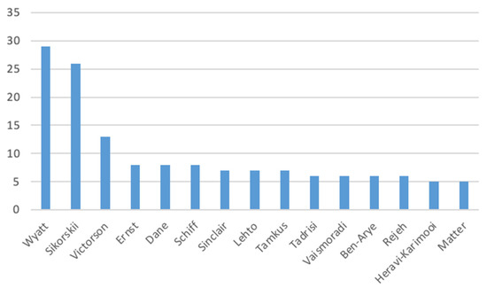 The foot reflexology research during this time frame covered 140 categories, and there were more than 2716 authors in the Web of Science Core Collection. The top 15 authors with the most publications are shown in Figure 5, with the top three authors being Wyatt, Sikorskii, and Victorson. Wyatt, Sikorskii, and Victorson have published 13 papers together, and Wyatt and Sikorskii have published 26 papers together. Wyatt began his research on reflexology for cancer and family caregivers in 2006 [46,49]. He collaborated with Sikorskii and Victorson on reflexology for cancer symptom management in 2007 and explored methodologies in CAM intervention trials in 2009–2010. He began his research on reflexology for advanced breast cancer in 2012–2013, studied clinical trials on caregiver-provided reflexology in 2015–2017, and began a number of ongoing randomized controlled trials for symptom management through family caregiver-provided reflexology for patients with advanced breast cancer in 2018–2021. Today, Wyatt is committed to researching the pain and psychological impact of reflexology on women with advanced breast cancer. As such, foot reflexology has progressed to the level of research that enhances patients’ psychological comfort to reduce pain.