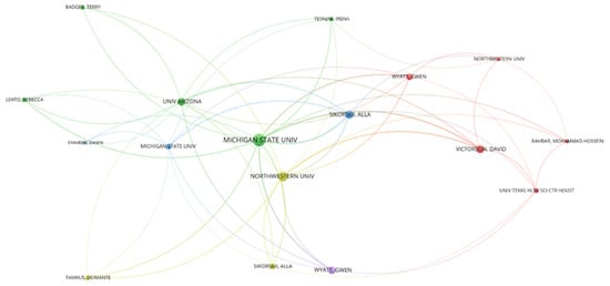 There were a number of closely collaborating author clusters within prolific authors and institutions with strong subcluster ties, as illustrated by the red, blue, and yellow clusters, using papers by Victorson (a medical scientist in the United States), Sikorskii (a psychiatry researcher in the United States), and Wyatt (a nursing researcher in the United States) as the core of their papers. The thickness of the line in Figure 6 represents the frequency of collaboration. The same color of a line means the same research topic, and the color change of a line between two points means that after collaborating for a period of time, the research direction changed. If the colors are similar at first, it means the research topic is highly similar. The red dots represent the three authors, Victorson, Wyatt, and Rahbar, who collaborated most closely with Northwestern University and the University of Texas Health Science Center at Houston on the topic. The blue dots represent collaborations between Sikorskii, Frames, and Michigan State University. The green dots represent Badger, Lehto, and Tesnjak’s collaborations with Michigan State University and the University of Arizona. The yellow dots represent Sikorskii and Tamkus’ affiliation with Northwestern University. The purple dots represent Wyatt’s cross-collaboration with Michigan State University across different research themes. The same authors worked on different areas of foot reflexology [57]. The collaborative network of highly productive authors and research institutions is shown in Figure 4.
