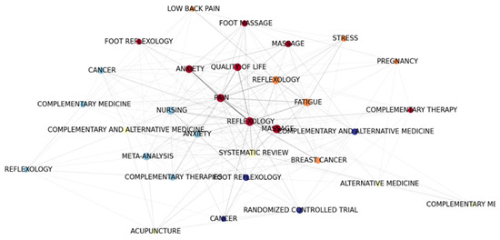 From the reflexology keyword co-occurrence clustering, five clusters of related studies could be found. In the reflexology keyword co-occurrence clustering map shown in Figure 8, these clusters are presented in different colors: (1) orange, representing foot reflexology and female status; (2) red, representing foot reflexology and quality of life; (3) light blue, representing foot reflexology as CAM; (4) dark blue, representing foot reflexology and cancer research; and (5) light yellow, representing foot reflexology and CAM system evaluation.