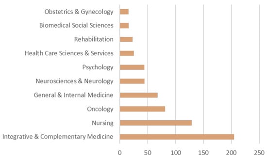 According to Clarivate Analytics’ Web of Science classification, most publications in the field of foot reflexology are related to ten major categories: integrative complementary medicine; nursing; oncology; medicine, general and internal; neurosciences and neurology; psychology; health care sciences and services; rehabilitation; biomedical social sciences; and obstetrics and gynecology, as shown in Figure 9. In terms of the number of publications, these ten major categories are the main directions of future foot reflexology research. The ten research directions account for 61% of the publications related to foot reflexology, indicating that the applications of foot reflexology are no longer a single direction of research but focus more on the breadth and depth of research in medical, nursing, and psychological applications. At the same time, these directions are also the future research trends of preventive medicine [7,62].