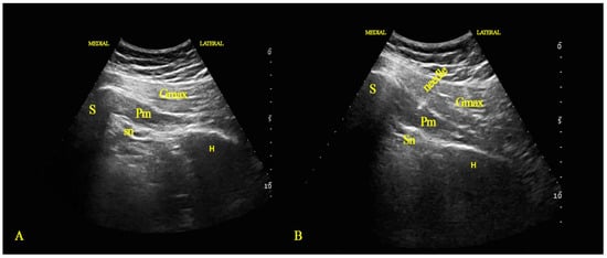 Each patient was placed in a prone position. The buttock region was scanned with either a 6–13 MHz linear array transducer or a 2–5 MHz curvilinear array transducer (M-Turbo®, FUJIFILM Sonosite, Bothell, DC, USA), according to the patient’s build. The transducer was parallel to the piriformis muscle (PM), with the medial side directed to the sacrum and the lateral side towards the great trochanter (Figure 1A).